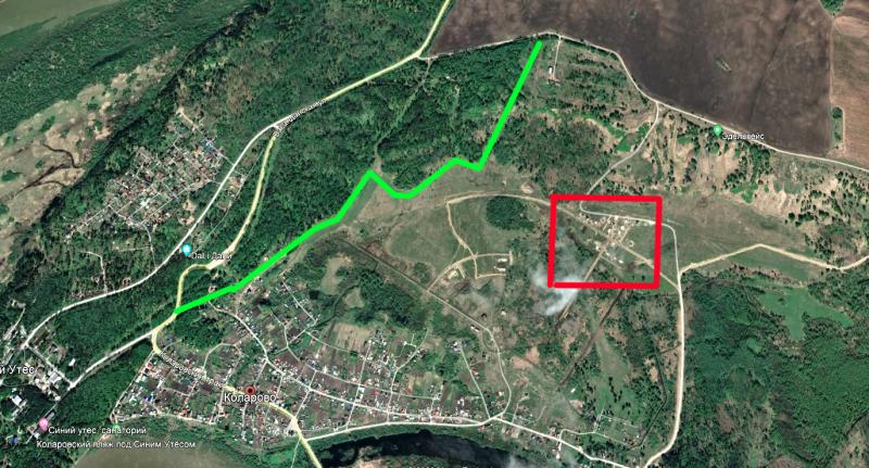 Теперь поговорим на счет «хвойного» леса и «единения» с природой. Красным на карте отмечен сам «Заповедный». Зеленым - граница того самого рекламируемого леса, представлена она узкой полосой. В основном из берез и редких сосен. И находится в трех километрах от строящегося поселка. Ровно, как и «Синий утес». Справа от Белявского чудо-поселения - болото с кустами. Сверху - пашня. Сам лес очень редкий, в нем построены жилые дома и гуляют люди.