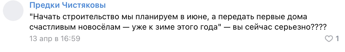 К слову, ранее Беляев обещал построить 70 домов к сентябрю 2020 года. Затем еще по 100 домов каждый год (подробнее о наполеоновских планах и фирме-застройщике в расследовании: «Томский микрорайон «Заповедный»: большая земельная афера»). Тем временем, готовы только два дома. А депутат продолжает обещать томичам золотые горы, покупку которых даже можно оформить в ипотеку в «Сбербанке». Неудивительно, что народ ему уже не верят.