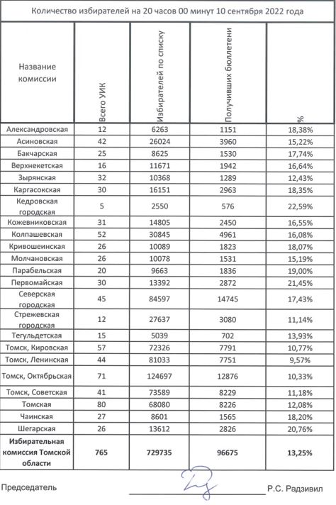 Избирком Томской области опубликовал сведения об участии избирателей в выборах губернатора региона по состоянию на 20:00 10 сентября 2022 года.