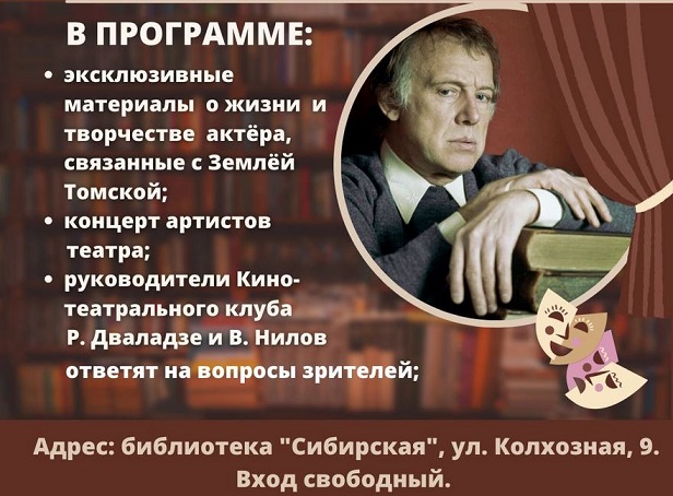 В томской модельной библиотеке «Сибирская» 17 декабря состоится творческая встреча любителей кино и театра «Мифы и жизнь великого русского актёра Иннокентия Смоктуновского».