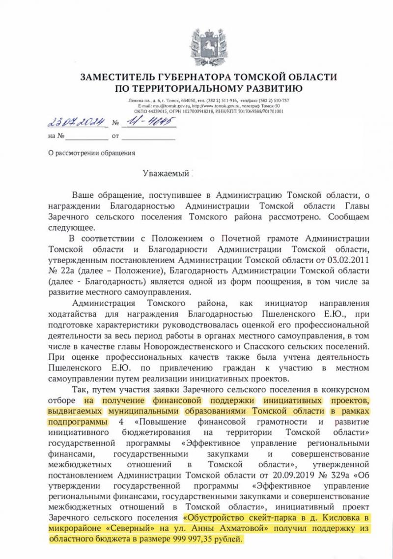 Жители Заречного сельского поселения тоже представили свой проект в рамках этой программы, подав заявку в департамент финансов Томской области в декабре 2024 года. В феврале этот проект выиграл отбор областного конкурса, получив финансовую поддержку. В марте 2024 года на реализацию проекта перечислили 689 тысяч рублей. Деньги получила администрация Заречного сельского поселения.
