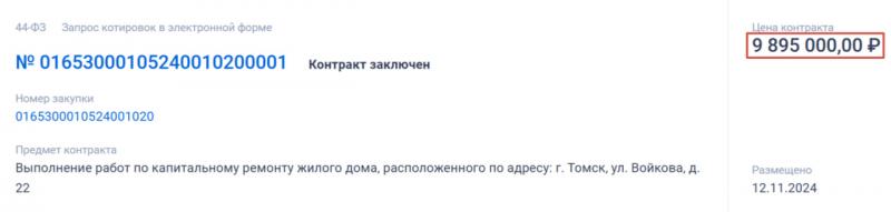 И вот появилась информация о том, что ремонтом дома на Войкова займётся ООО «Восток» (ОГРН 1117017004257). Это действительно так, подтверждение мы нашли на сайте zakupki.gov.ru. Цена контракта, заключённого ещё 12 ноября 2024 года, – 9,8 миллиона рублей.