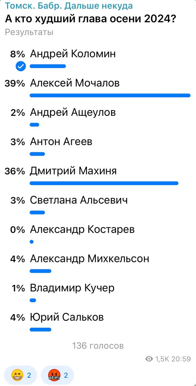 В телеграм-канале «Томск. Дальше некуда» подписчики снова оценили качество работы политиков, мэров и глав районов Томской области. Бабр представляет итоги опросов, в которых предлагалось выбрать наиболее эффективных представителей власти и тех, кто не оправдал ожидания жителей региона.