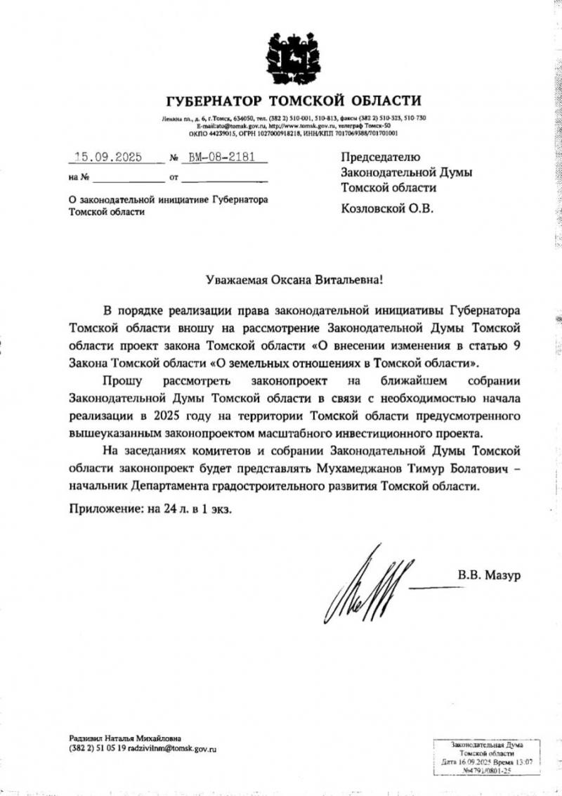 Губернатор Владимир Мазур предложил изменить закон «О земельных отношениях в Томской области».