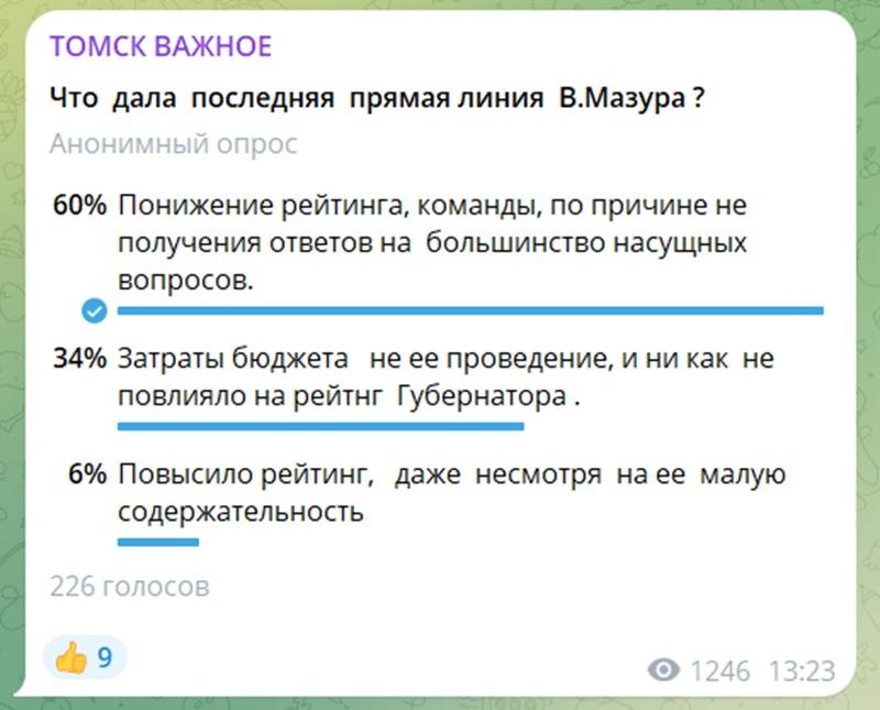 Автор канала «Наблюдатель в Томске» критикует такую форму общения. Он указывает на плохую режиссуру и на то, что губернатор часто путает названия улиц и городов. Опрос в телеграм-канале «ТОМСК ВАЖНОЕ» подтвердил негативный настрой жителей: большинство проголосовавших считают, что на их реальные вопросы ответов так и не прозвучало. Многие уверены, что такие эфиры только вредят рейтингу губернатора, так как люди не видят перемен за фасадом громких слов о «прорывах».