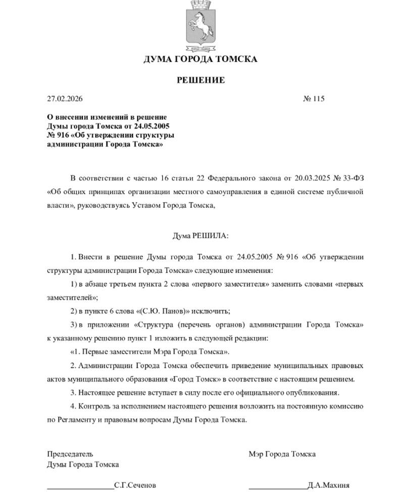 Мэр Томска Дмитрий Махиня решил, что один первый заместитель — это слишком мало для эффективного управления городом. Теперь в структуре администрации официально значатся сразу два «первых» вице-мэра, что превращает мэрию в сомнительный административный гибрид. Соответствующее решение городская дума приняла на сессии 27 февраля 2026 года.