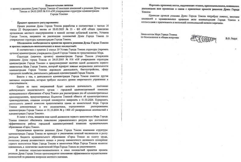 Формально чиновники провернули обычную кадровую рокировку. В решении думы Томска от 24 мая 2005 года просто заменили слова «первого заместителя» на «первых заместителей». Чтобы не злить общественность разговорами о раздувании штата, одну должность обычного зама упразднили, а на её месте создали второе «первое» кресло. Финансово-экономическое обоснование за подписью заместителя по безопасности Владимира Радула гласит, что бюджет города не пострадает. Зарплаты и надбавки у обычных замов и «первых» якобы одинаковые, поэтому дополнительных трат на содержание чиновников не потребуется.