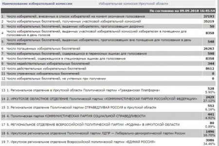Избирательная комиссия Иркутской области обработала более 100 тысяч голосов. КПРФ вырвалась на первое место, обогнав «Единую Россию» на 5,24%: первые набрали 32,44% голосов, вторые – 27,2%. ЛДПР с 16,97% голосов по-прежнему занимает третье место.
